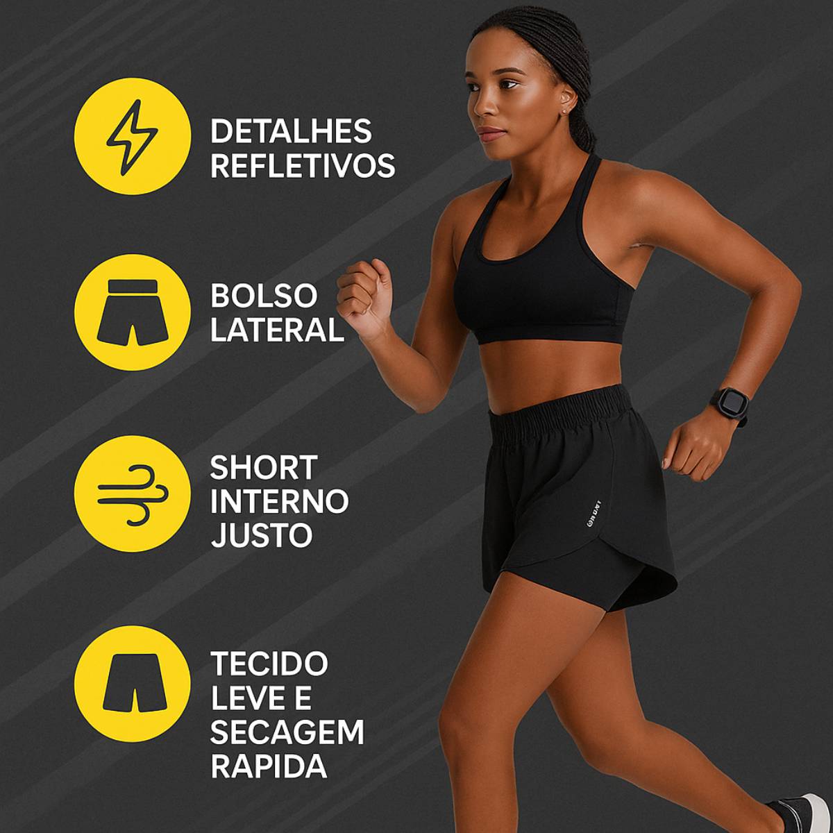 - Modelagem Dupla: camada externa leve e ampla para mobilidade, com short interno justo para sustentação e segurança.